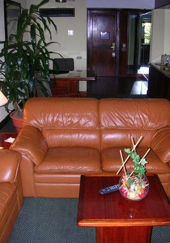 I walk in and realize they have confused me with another visiting American and given me his luxury suite! The entire hotel is covered in rich woods that are highly polished to show their beautiful wood grain, this room is no exception. Also included in this room is: 1.5 bathrooms, desk with computer, monitor, printer, 2 televisions, living room, patio, bedroom, and excellent views facing two directions.