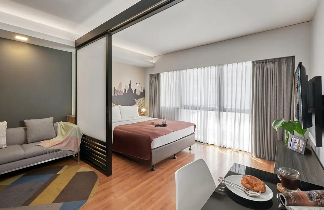 Citadines Sukhumvit 11 Bangkok offers 4-star serviced apartments in a vibrant area with a night market, restaurants, and pubs. The hotel features amenities such as a rooftop pool, fitness center, and free tuk-tuk service to Nana BTS Skytrain Station, just a 5-minute ride away.
