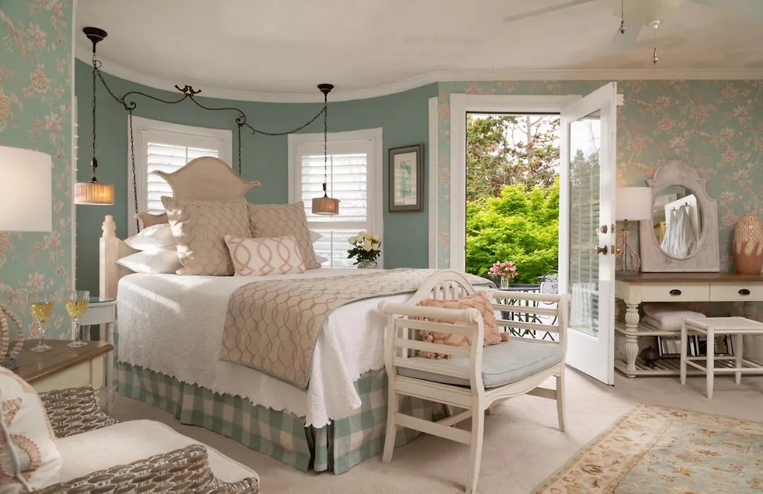 Rooms at White Doe Inn Bed & Breakfast exhibit unique architectural designs, including a grand three-story tower and two-story bays. Guests can enjoy features like air conditioning, seating areas, and fireplaces. Some rooms include private balconies, perfect for enjoying views of the gardens.