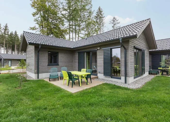Rooms at Center Parcs Park Allgaeu range from Comfort to Exclusive cottages, accommodating 2 to 12 guests. Select accommodations offer amenities such as a private outdoor hot tub, sauna, and terrace. All units include modern furnishings and cooking facilities.
