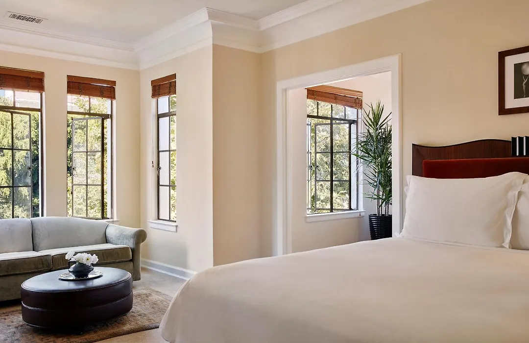 The guest rooms at Chateau Marmont offer a range of amenities including 42-inch flat-screen TVs, iPod docking stations, and complimentary WiFi. Guests can choose from oversized suites and hillside bungalows, some featuring terraces and panoramic views of the Sunset Strip.