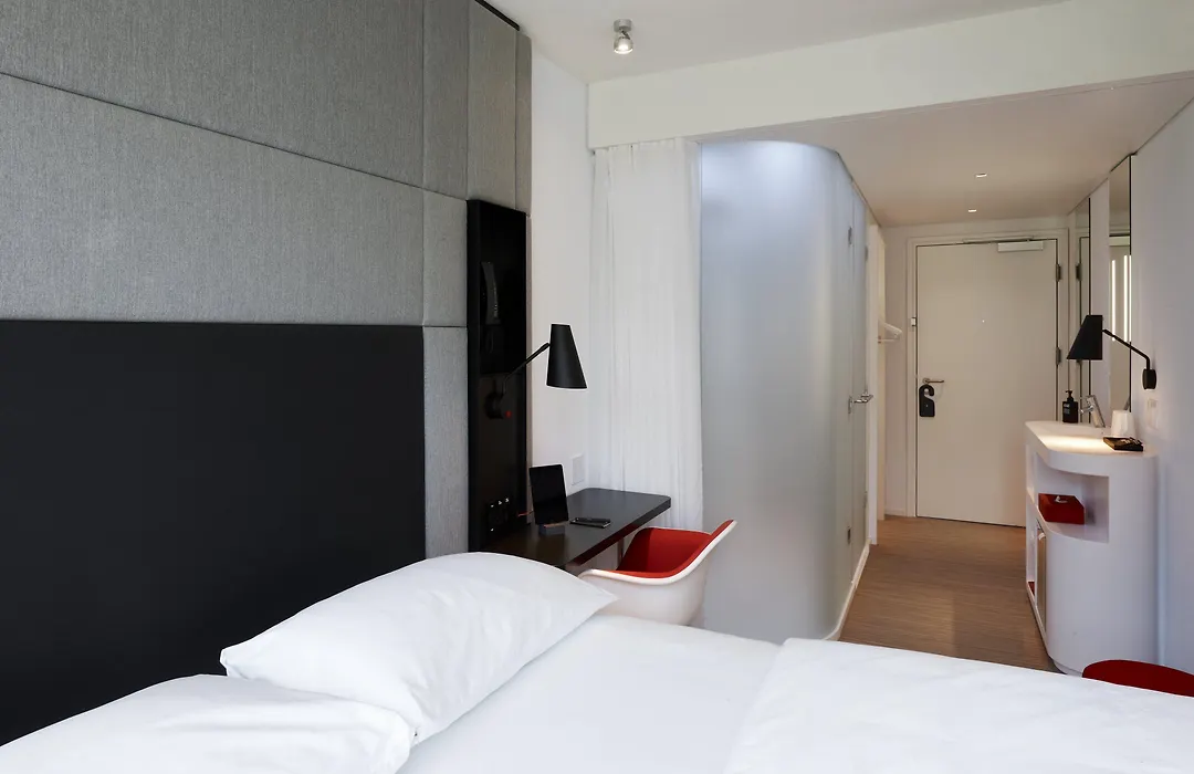 Rooms at Citizenm Seattle South Lake Union feature air conditioning, a flat-screen TV, and a private bathroom. Each unit includes a work desk and free toiletries, alongside modern decor and parquet flooring.