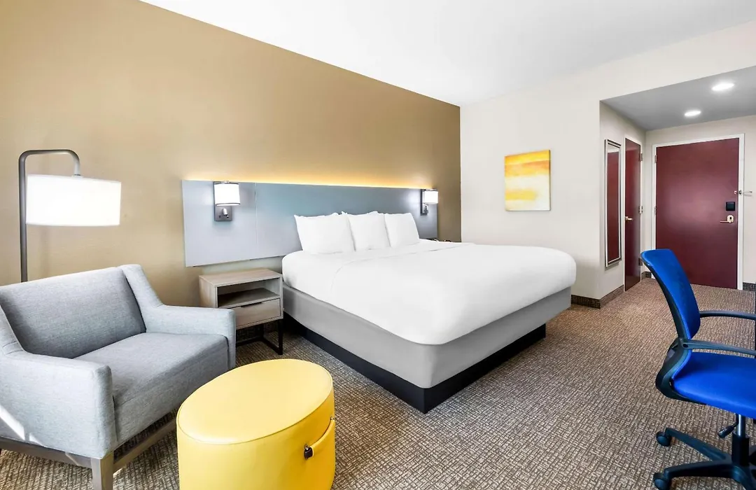 The hotel offers a free breakfast buffet each morning, featuring eggs, meat, yogurt, fresh fruit, cereal, and a selection of hot waffle flavors. Nearby dining options include various restaurants to cater to diverse tastes and preferences.