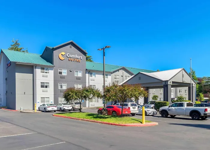 Comfort Suites Portland Airport is a 2-star hotel featuring spacious smoke-free suites with modern amenities and a fitness center. Guests benefit from a complimentary shuttle service to the nearby airport and can relax in an indoor heated pool.