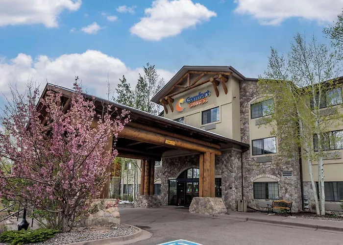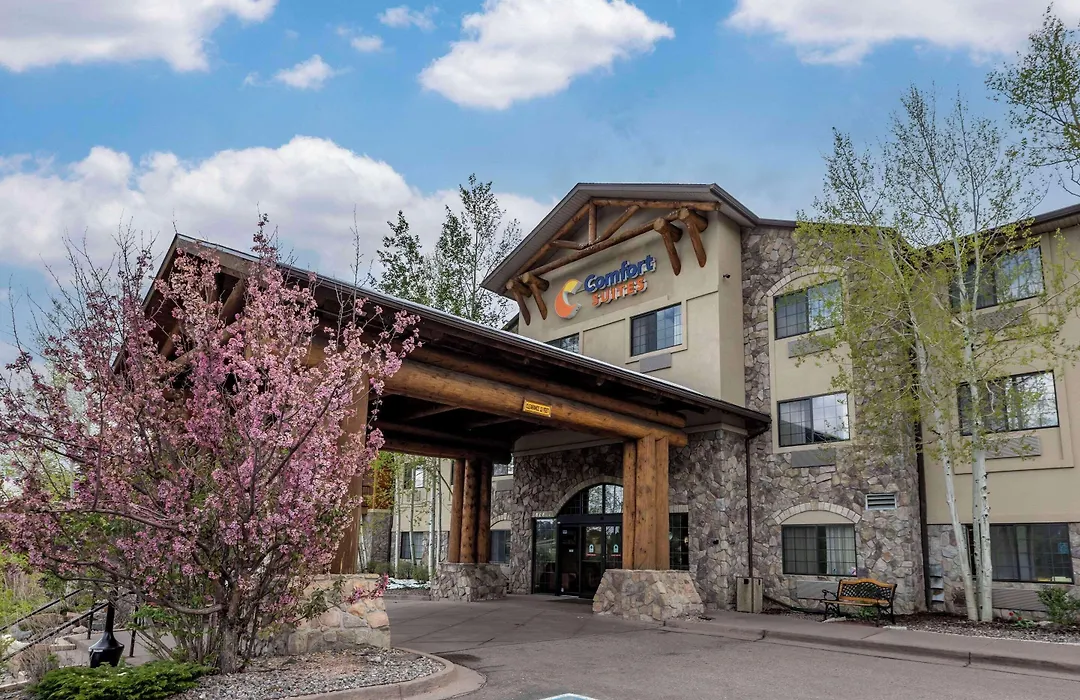 The rooms at Comfort Suites feature air conditioning, flat-screen TVs with cable channels, and tea and coffee makers. Many suites have balconies with mountain views, while some offer accessible facilities including roll-in showers. The design incorporates spacious lodge-style elements and carpeted floors.