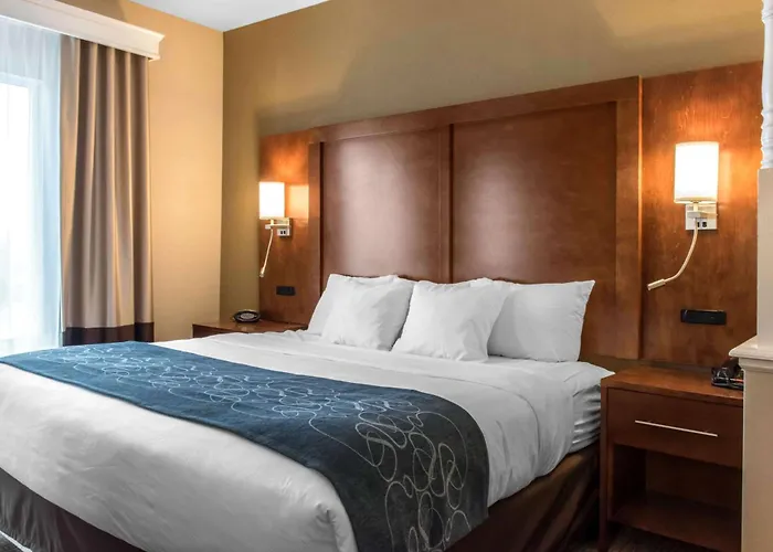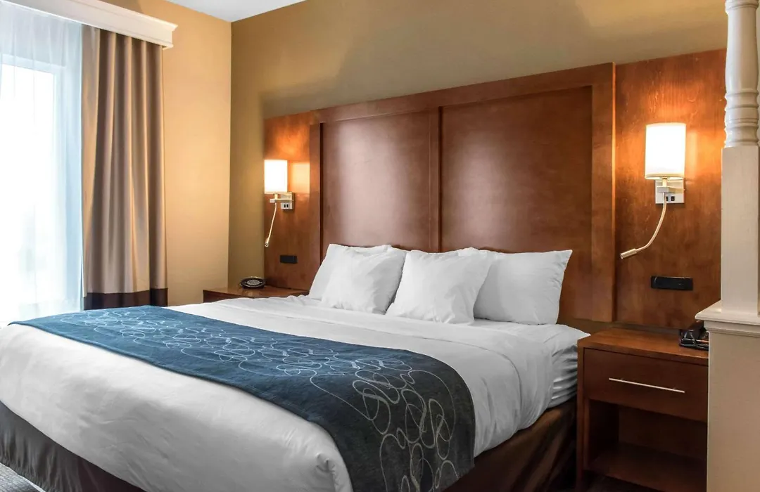 Rooms at Comfort Suites feature refrigerators, microwaves, coffee makers, and flat-screen TVs with cable channels, including free HBO. Each suite is designed to accommodate families or business travelers with distinct work and relaxation areas.