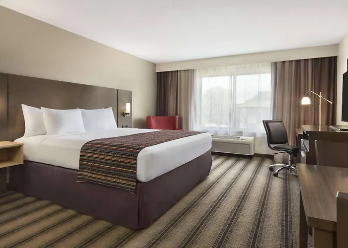 The Country Inn & Suites provides 78 guest rooms and suites furnished with flat-screen TVs, refrigerators, microwaves, coffee makers, and hair dryers. Each room includes complimentary amenities such as a work desk and ironing facilities. Spacious suites offer separate living areas with sleeper sofas and additional flat-screen TVs.