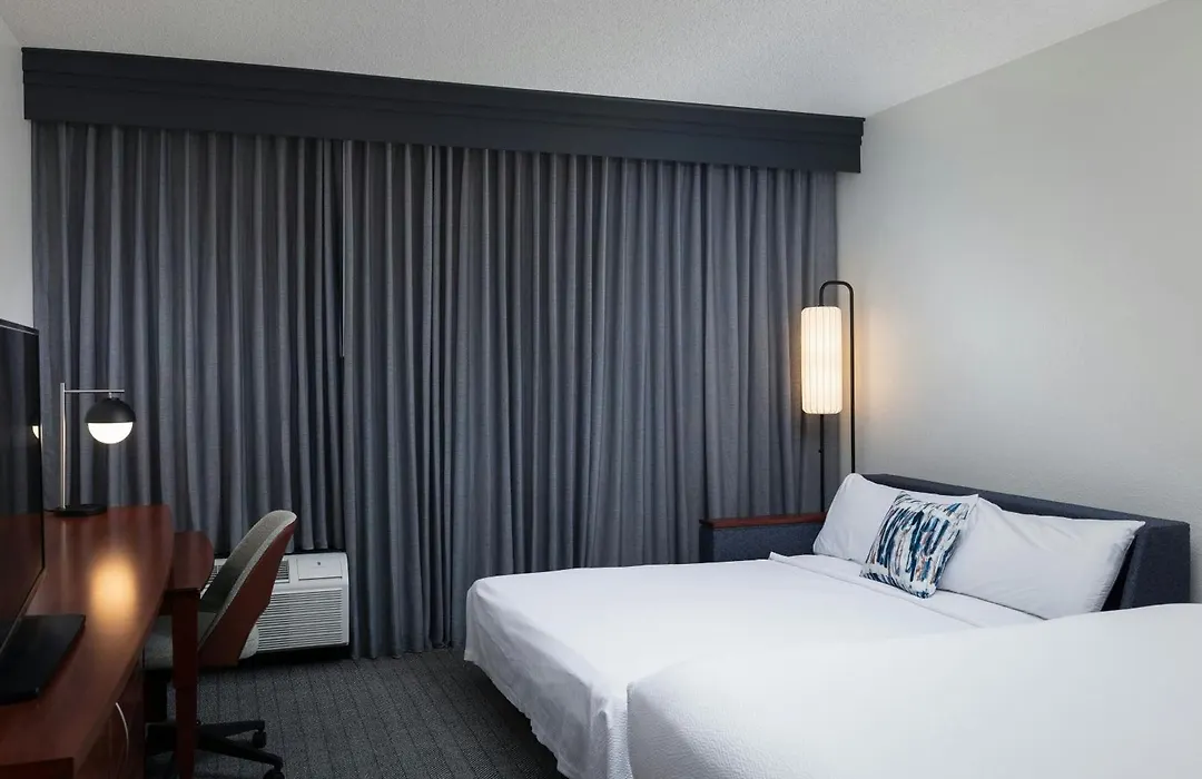 Rooms at Courtyard By Marriott Denver Central Park feature premium bedding, air conditioning, and a work desk, along with free WiFi access. Thoughtful amenities include minibars, flat-screen TVs, and partially open bathrooms with complimentary toiletries.