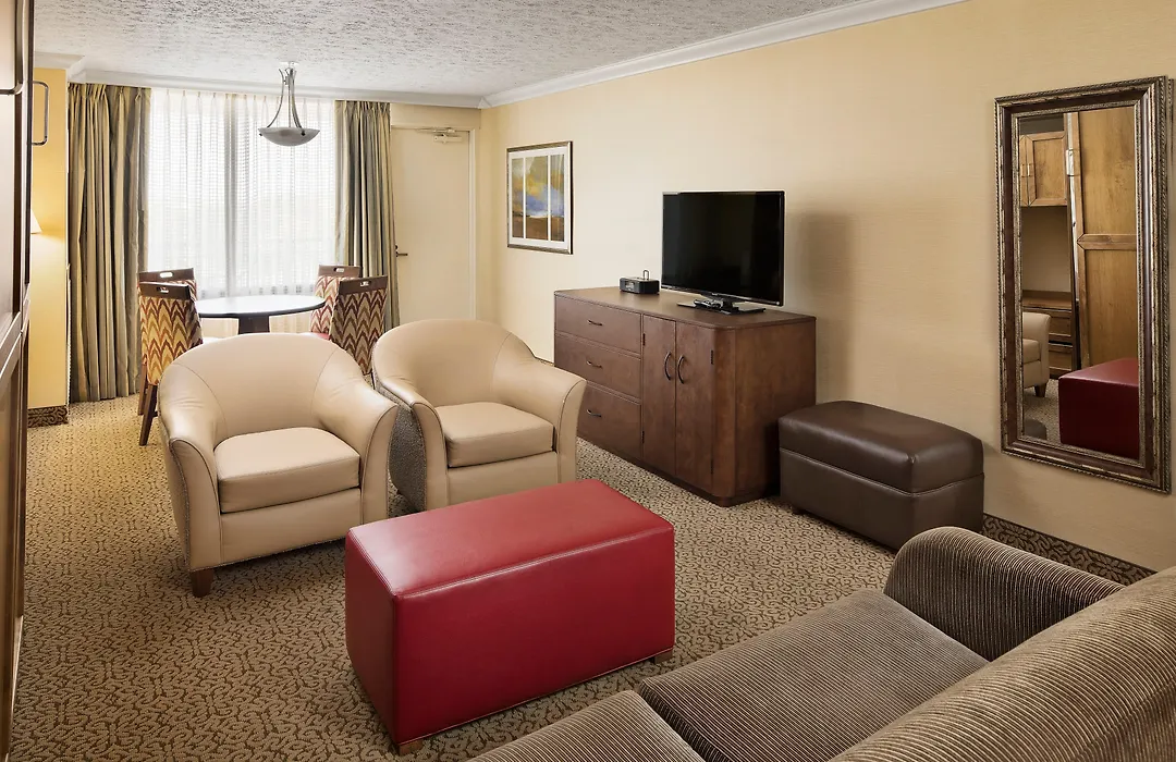 Guest rooms at Crowne Plaza feature modern amenities such as complimentary Wi-Fi, flat-screen televisions, and spacious work desks. The hotel offers a variety of one and two-bedroom suites for added comfort, each with stylish decor and additional living space.