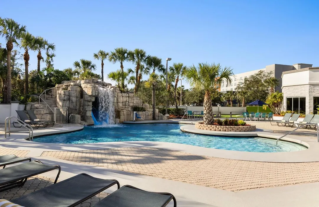The hotel's outdoor area includes a pool with a thrilling waterslide and a cascading waterfall. Fitness facilities are available for maintaining an active lifestyle, while the concierge service assists with area attractions and activities. Nearby shopping centers, such as Orlando Premium Outlet Shopping Center, offer additional options for entertainment.