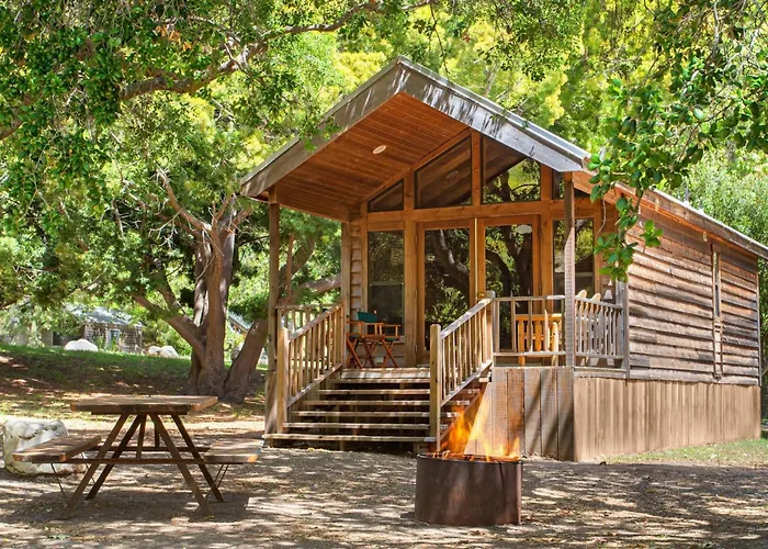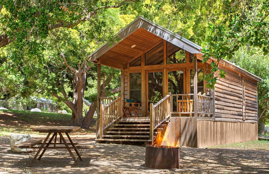 Accommodations at El Capitan Canyon include cedar cabins and adventure yurts, each designed for comfort and adventure. All cabins offer standard bathroom facilities, kitchenettes, and outdoor areas complete with fire pits for grill dining. The yurts feature raised wooden floors and skylights for stargazing.