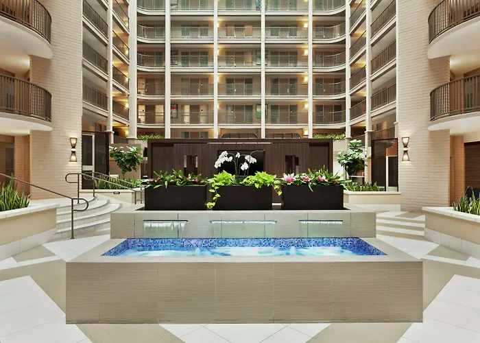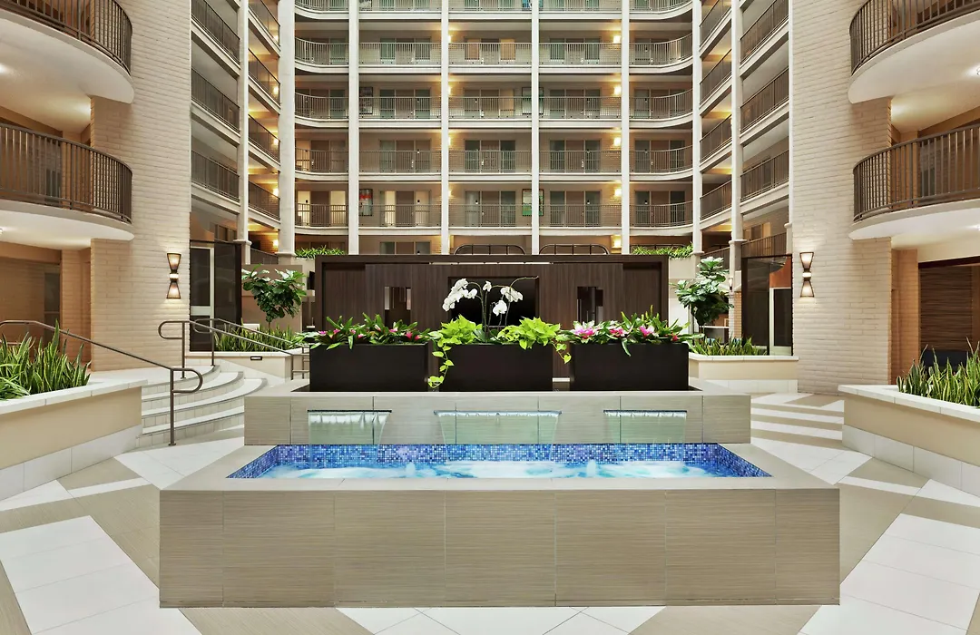 The Embassy Suites offers 191 spacious rooms equipped with separate living areas, premium bedding, and two flat-screen TVs. Additional amenities include a work desk, microwave, refrigerator, and free WiFi access, ensuring a comfortable stay for guests.