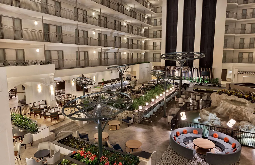 Embassy Suites Dallas - Dfw International Airport South offers a free airport shuttle to Dallas-Fort Worth International Airport, located 6 miles away. The hotel features 5965 square feet of meeting and event spaces suitable for business needs.