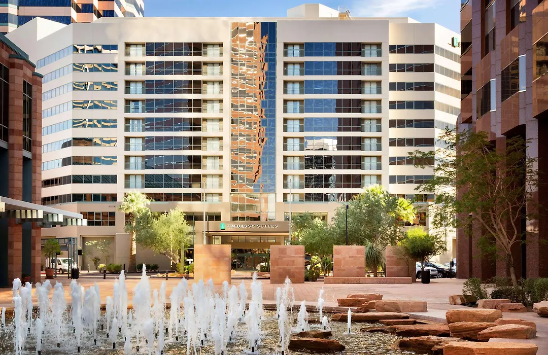 Embassy Suites By Hilton Phoenix Downtown North is a 3-star hotel rated 9.0/10 on Booking.com, featuring a restaurant and an indoor pool. It offers amenities such as free made-to-order breakfast and room service, making it suitable for family-friendly stays.