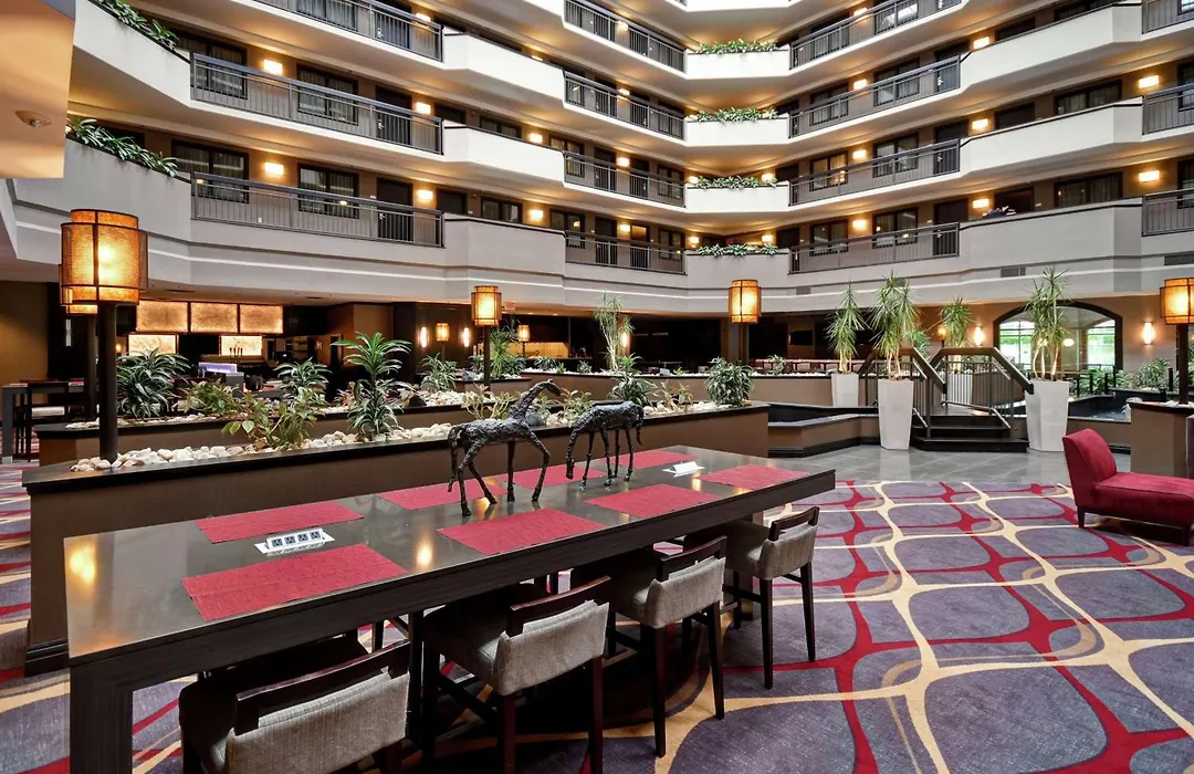 All 150 suites at Embassy Suites include amenities such as premium bedding, wet bars, and air conditioning. Some accommodations feature separate sitting areas to enhance the guest experience.