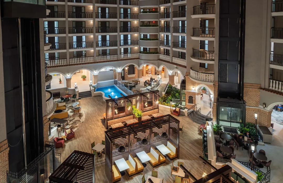 Every suite at Embassy Suites includes a separate living room with a sofa bed, air conditioning, and a flat-screen TV. Guests can enjoy a complimentary evening reception daily in the tropical garden atrium, while some units offer a private balcony with lake views.