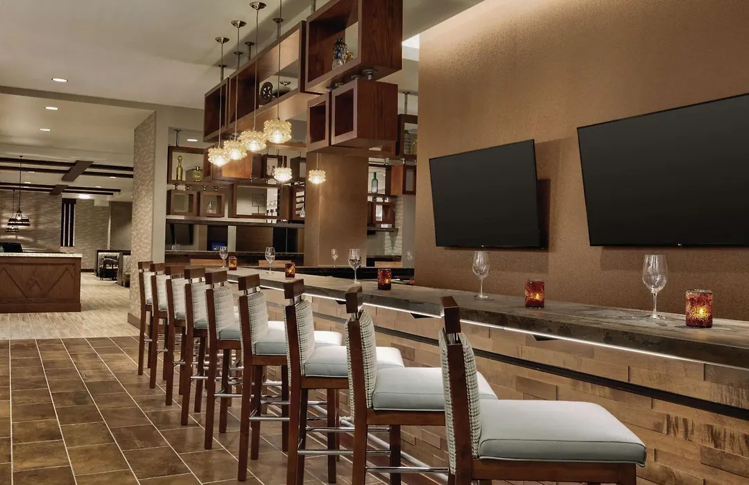 Dining options include Brickstones Kitchen and Bar, which specializes in American cuisine with dishes like burgers and fresh oven-baked pizza. Guests can also enjoy snacks and beverages at the 24-hour Corner Pantry.