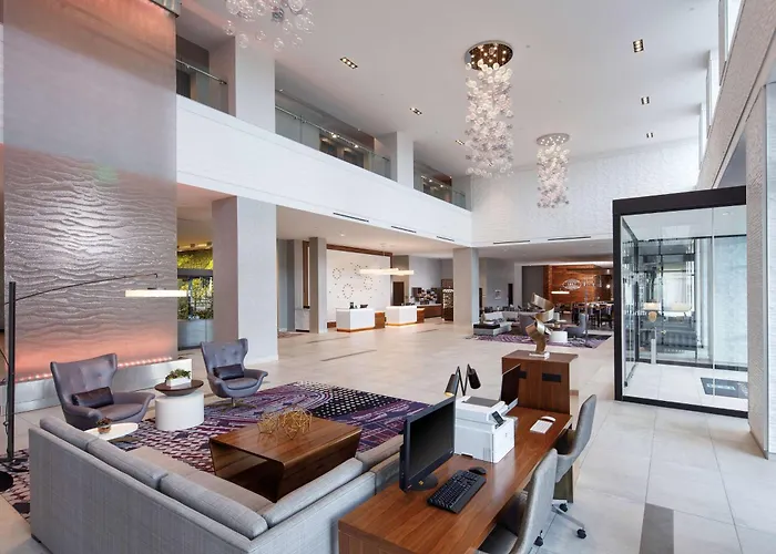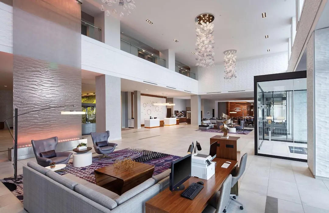 Embassy Suites offers a 24-hour business center, meeting rooms, and concierge services for corporate travelers. Self-parking and valet parking are available. The hotel is pet-friendly, allowing medium-sized pets with a deposit.