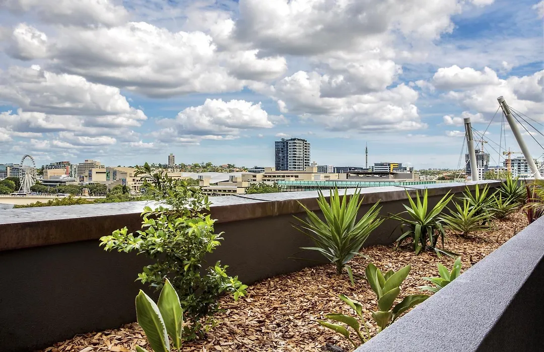 The well-appointed apartments feature queen beds with triple sheeting, flat-screen TVs, and fully equipped kitchens, along with private balconies that provide stunning views of the Brisbane River or city.