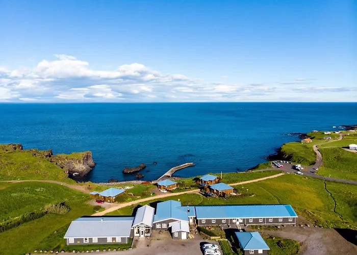 Fosshotel Hellnar, a 3-star eco-friendly hotel with a rating of 8.5/10 on Booking.com, offers beautiful views of cliffed coasts and access to hiking trails. Guests can enjoy an onsite restaurant serving local cuisine, a hotel bar, and a library lounge for relaxation.