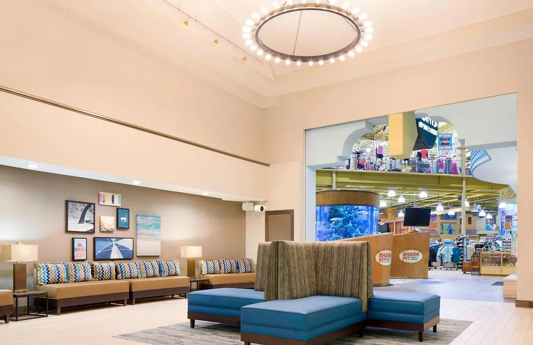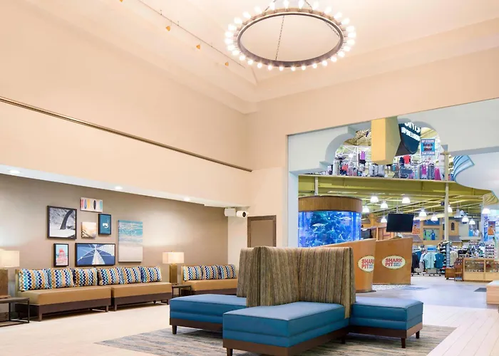 Dining options include the Shark Pit Bar & Grill, which serves a variety of meals and features its famous hand-tossed pizza cooked in an open-face pizza oven. Guests can also enjoy Starbucks coffee available on-site.
