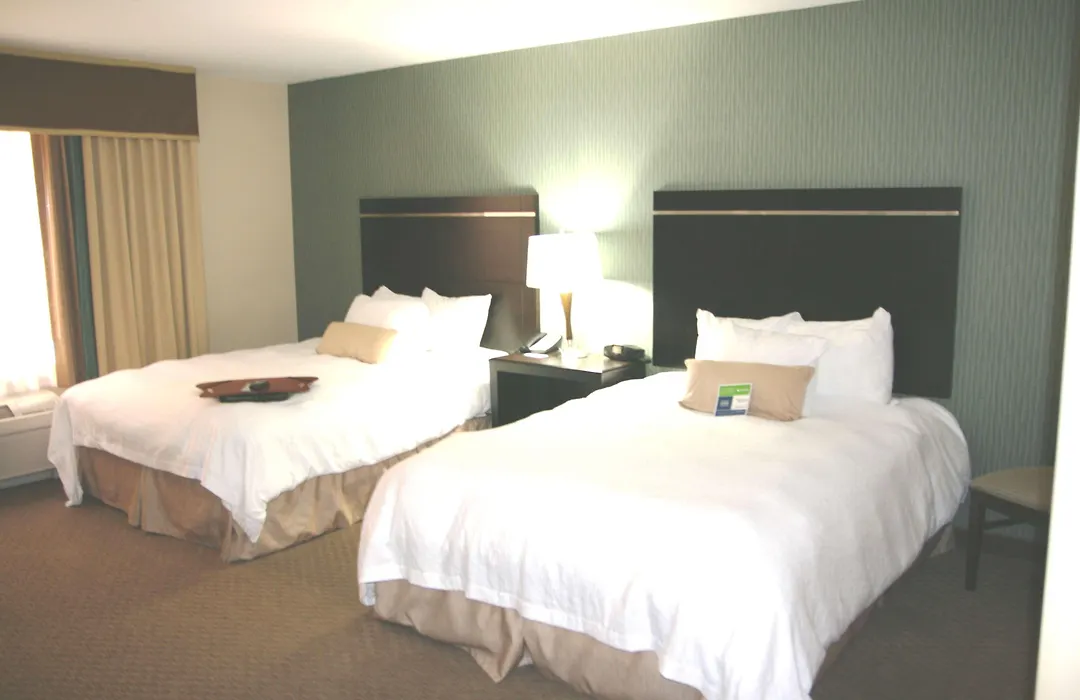 Each guest room in the Hampton Inn features air conditioning, a flat-screen TV with cable channels, a tea and coffee maker, and complimentary Wi-Fi. Rooms include options for king and queen beds, with spacious studio accommodations also available.
