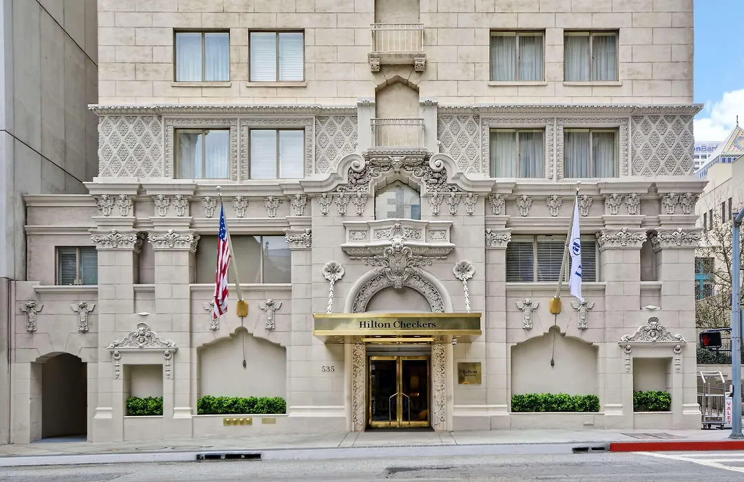 Hilton Checkers Los Angeles, a 3-star hotel with a 7.7/10 rating, offers notable amenities including a rooftop terrace with skyline views of downtown LA and Checker's Restaurant. This historic property features Art Deco-inspired architecture in the Financial District.