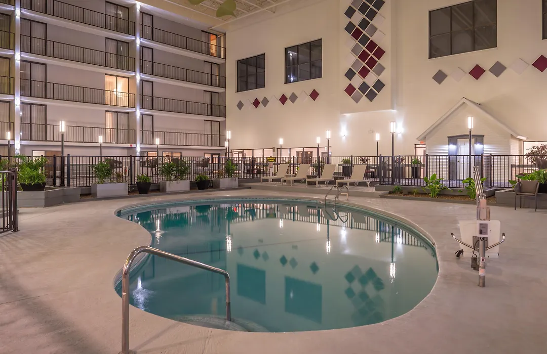 The Auburn hotel features an indoor atrium pool, ideal for family gatherings and relaxation. For business needs, the hotel offers event space accommodating up to 300 guests, along with audio-visual equipment for meetings. A fitness center is also available for guests wishing to maintain their routine during their stay.