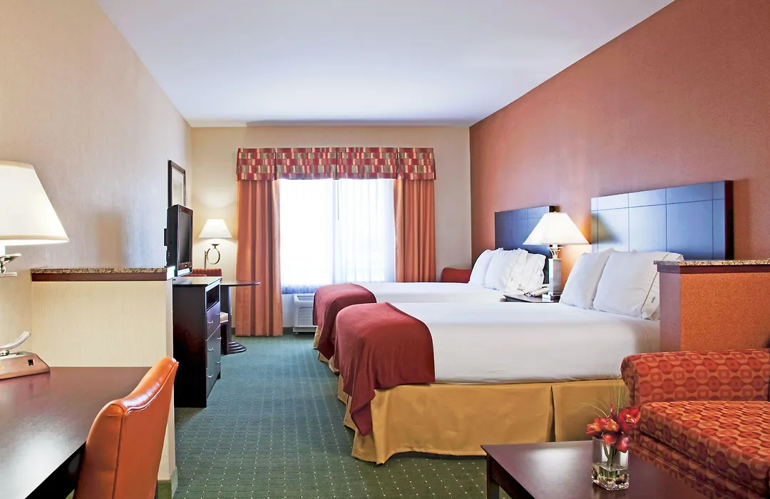 Rooms at Holiday Inn Express feature a flat-screen TV, microwave, mini-refrigerator, and high-speed wireless internet. Some units offer a seating area for relaxation, and accessible rooms are available including roll-in showers. The hotel contains 98 rooms total and is pet-friendly.