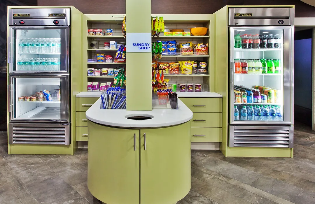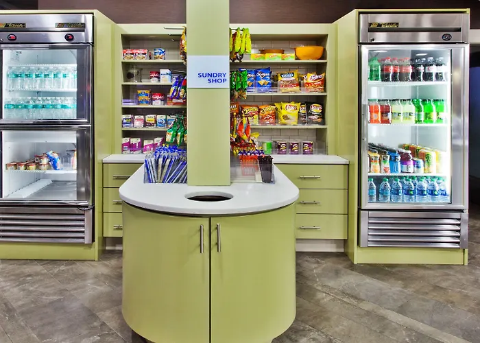 Dining options include a daily complimentary hot breakfast buffet featuring pancakes, eggs, and other customizable options. Nearby dining includes numerous restaurants such as Maggiano's Little Italy and Teds Montana Grill, all within walking distance.
