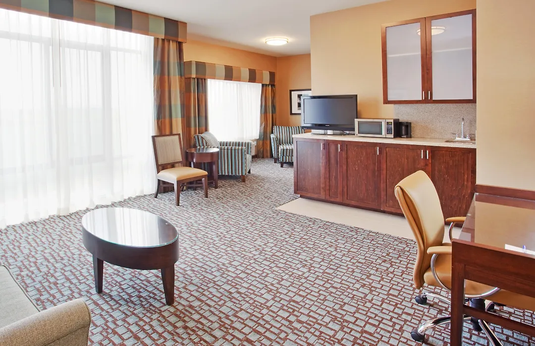 Rooms are equipped with modern features such as high-speed free WiFi, flat-panel TVs, work desks with ergonomic chairs, refrigerators, and microwaves. Guests can choose from options that include one king or two queen beds, suites with a separate living area, and executive suites with wet bars.
