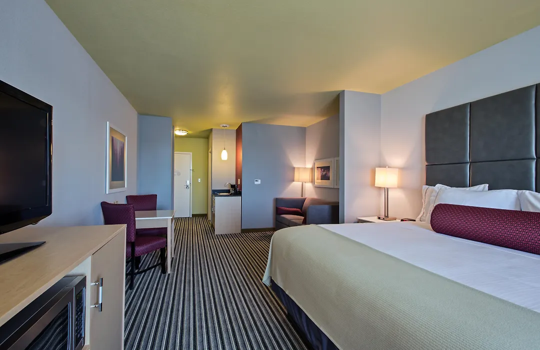 Rooms at the Holiday Inn Express include amenities like refrigerators, microwaves, and flat-screen TVs with cable channels. Certain units feature a seating area for relaxation, and guests can find both king and two queen bed options available. All guestrooms are equipped with air conditioning and free toiletries.