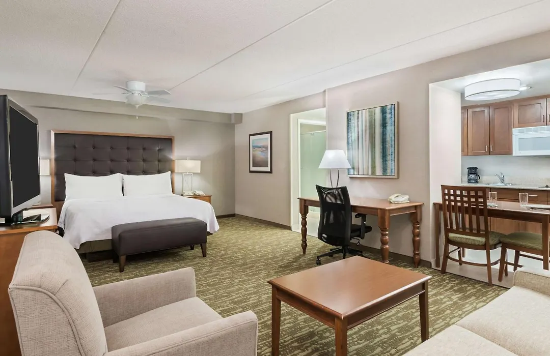 All accommodations at Homewood Suites include a living area equipped with a sofa, flat-screen TV, air conditioning, and kitchen amenities such as a microwave and coffee maker. Suites also offer free WiFi and safety deposit boxes, catering to both relaxation and productivity.