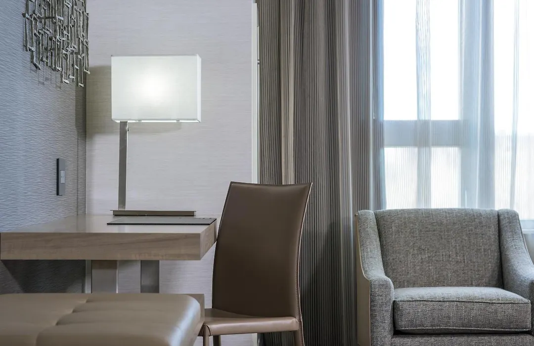 Guestrooms at AC Hotel By Marriott Boston Cambridge include premium bedding, pillow menus, air conditioning, and a 51-inch LED flat-screen internet TV. Each room also contains a refrigerator and includes free Wi-Fi for convenient streaming. The design emphasizes openness and minimal clutter, creating an efficient environment for guests.