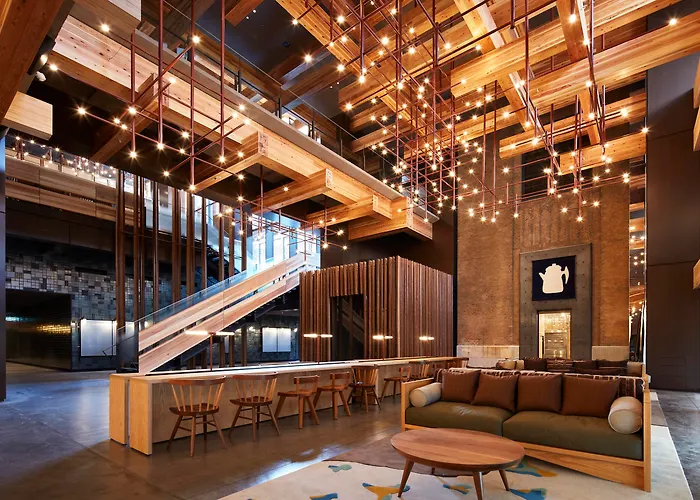 Ace Hotel Kyoto, a 5-star hotel rated 9.2/10 on Booking.com, integrates Art Deco design and contemporary features within the landmark 1926 former Kyoto Central Telephone Office. This pet-friendly hotel includes a vibrant lobby, a garden courtyard, and Japan's first Stumptown Coffee Roasters outpost.