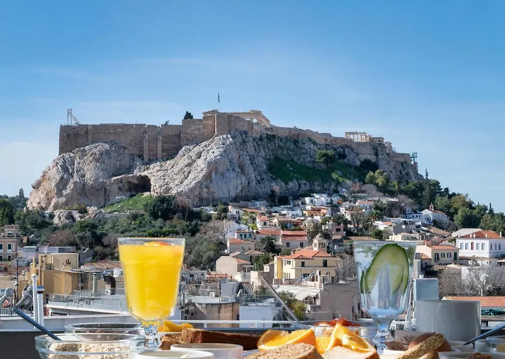 The hotel serves a free continental breakfast on its rooftop, enhancing the dining experience with views of the Acropolis. There is also a bar where guests can enjoy cocktails in the evening.