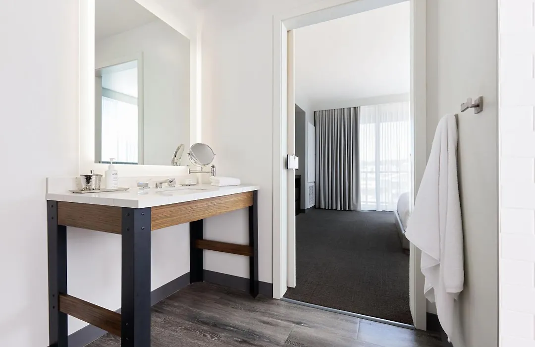 Guest rooms at Archer Hotel Boston/Burlington feature four distinct design palettes and premium amenities, including five-star beds, Frette bathrobes, and Nespresso coffee experiences. The deluxe king mobility-accessible studio suite showcases a California king platform bed and a fully equipped wet bar, meeting the needs of diverse travelers.