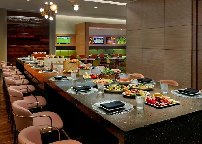 Dining options at the Atlanta Airport Marriott Gateway include Champions restaurant with a variety of craft beers and Southern comfort food, as well as Terminal East coffee shop serving breakfast sandwiches and Starbucks coffee. Guests can also enjoy the 24-Hour Market for quick snacks and in-room dining services.