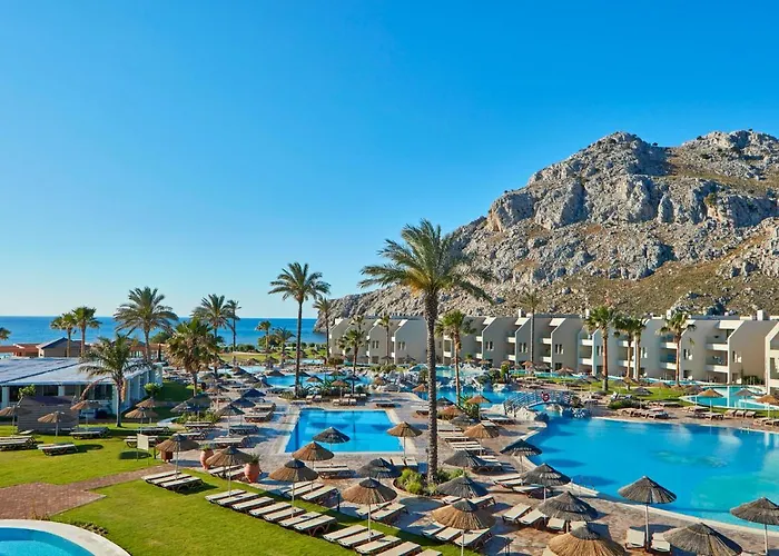 Atlantica Aegean Blue, a 5-star Kolymbia hotel rated 8.8/10 on Booking.com, offers family-friendly accommodations and a vibrant onsite water park. Guests can enjoy direct beach access and a variety of dining options amidst scenic surroundings.