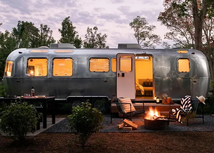 Guests can choose from Luxury Tents and Airstreams, equipped with mini refrigerators, basic cookware, and luxury bath products. The accommodations have both seating areas and modern spa-inspired bathrooms, providing comfort during their stay.