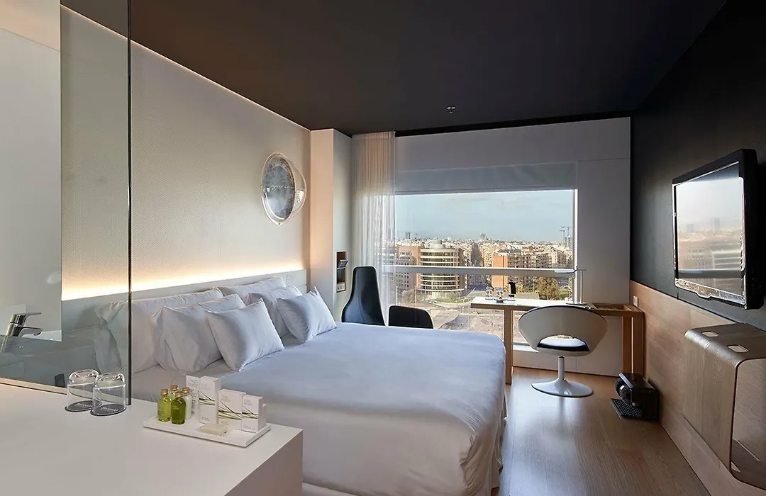 Barcelo Sants, a 4-star hotel with an 8.7/10 rating on Booking.com, features contemporary design resembling an orbital station. It offers a fully equipped gym, two restaurants, and direct access to the AVE and metro networks. The hotel is well-connected for business and leisure travelers.