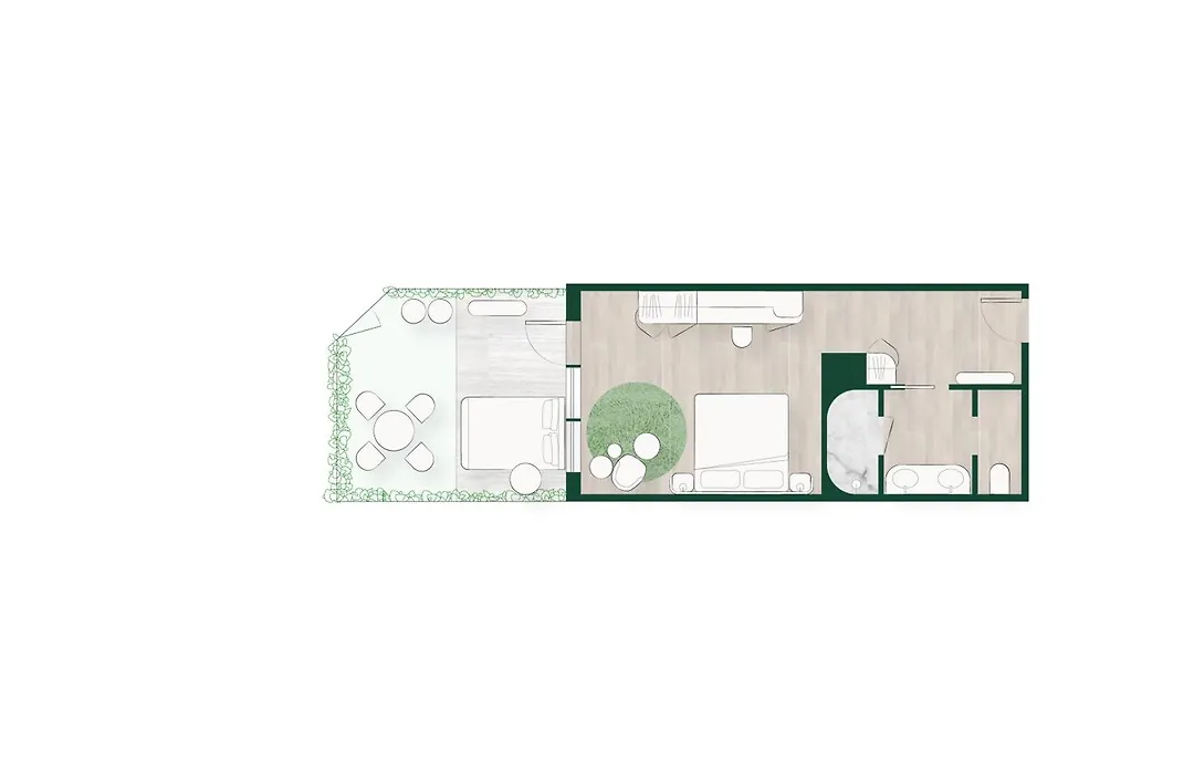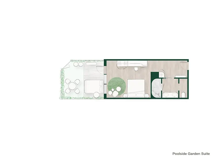 Guest rooms at Hotel Bardo Savannah feature contemporary design paired with comfort, including a flat-panel HDTV, mini-fridge, and Frette linens. Some suites offer private patios with garden views, while all accommodations are equipped with premium bed and bath amenities for a luxurious stay.