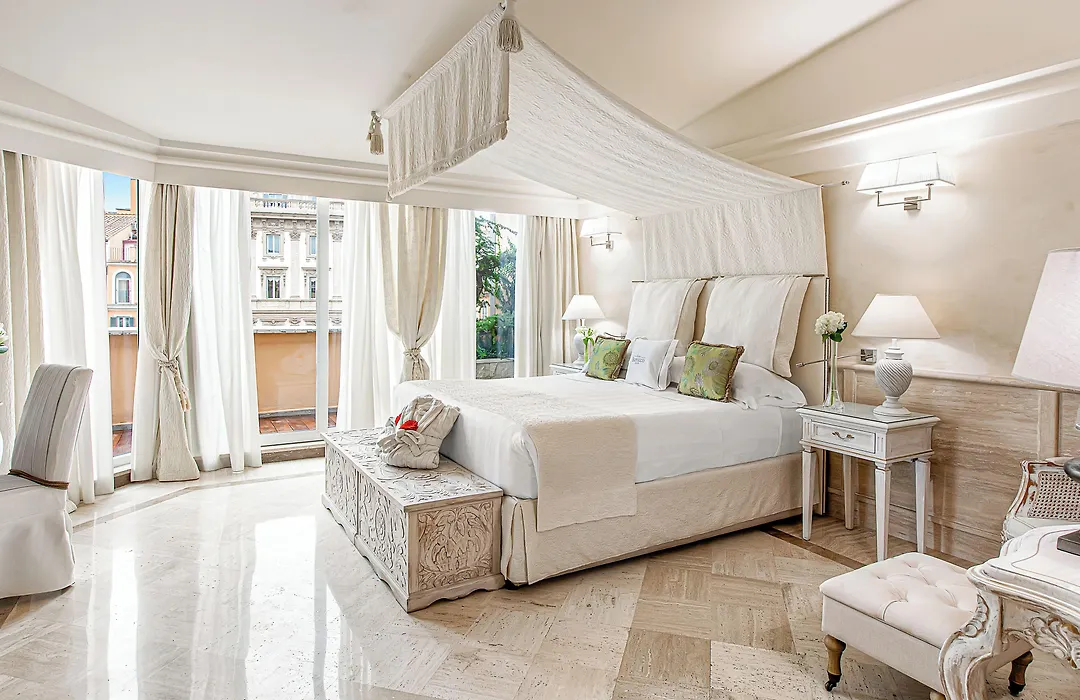 Hotel Barocco features fewer than 40 rooms and suites, each equipped with air conditioning, free Wi-Fi, soundproofing, and flat-screen TVs. Rooms offer views of Piazza Barberini and an understated design of sepia tones, Venetian plaster, and travertine finishes. Guests enjoy conveniences such as private bathrooms with luxury toiletries.