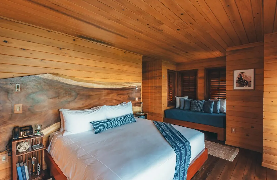 Dining options at the resort include The Clubhouse, serving fresh, sea-to-table cuisine, and The Buoy Room, a casual after-sail bar offering pizzas and local fare. Guests can also enjoy drinks at the Reef Sampler, a boat-turned-beach bar.