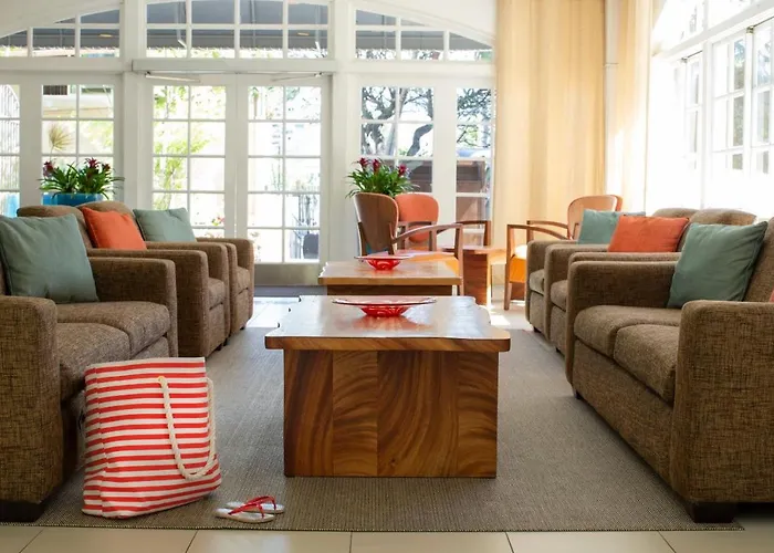 The hotel's outdoor areas include a heated pool and patio, ideal for relaxation. Close by, guests can explore white sand beaches and numerous dining venues such as Heavenly Island Lifestyle and Bills, offering locally-sourced dishes.