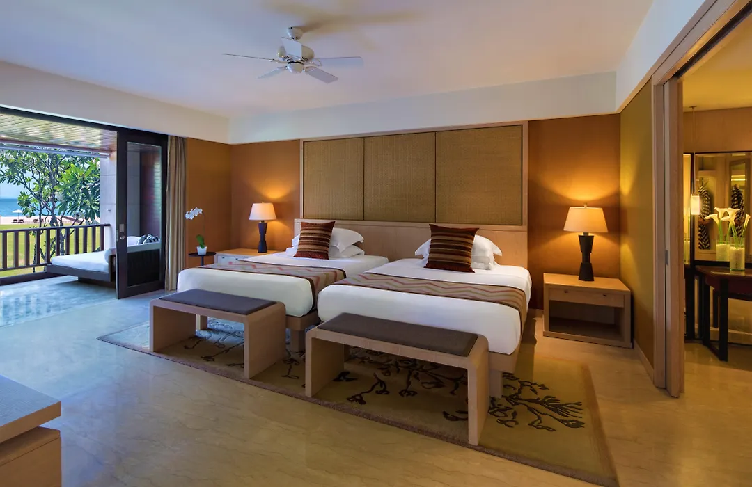 Accommodations at Conrad Bali feature spacious villas and suites, including options with separate living rooms, private gardens, and infinity pools. Many rooms provide direct access to the lagoon pool, while suites are ideal for families, offering a dining area and marbled bathrooms with dual vanities.