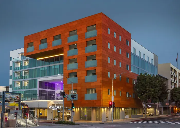 Courtyard By Marriott Santa Monica is a 3-star hotel with a rating of 7.8/10, featuring a central downtown location near shopping and dining. Guests can enjoy amenities such as an outdoor pool, a fitness center, and on-site dining at Waterman's Café, which specializes in American cuisine.