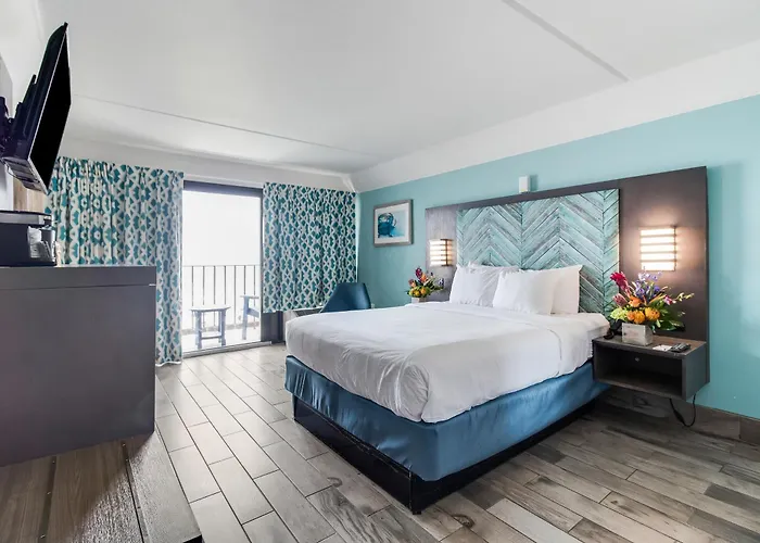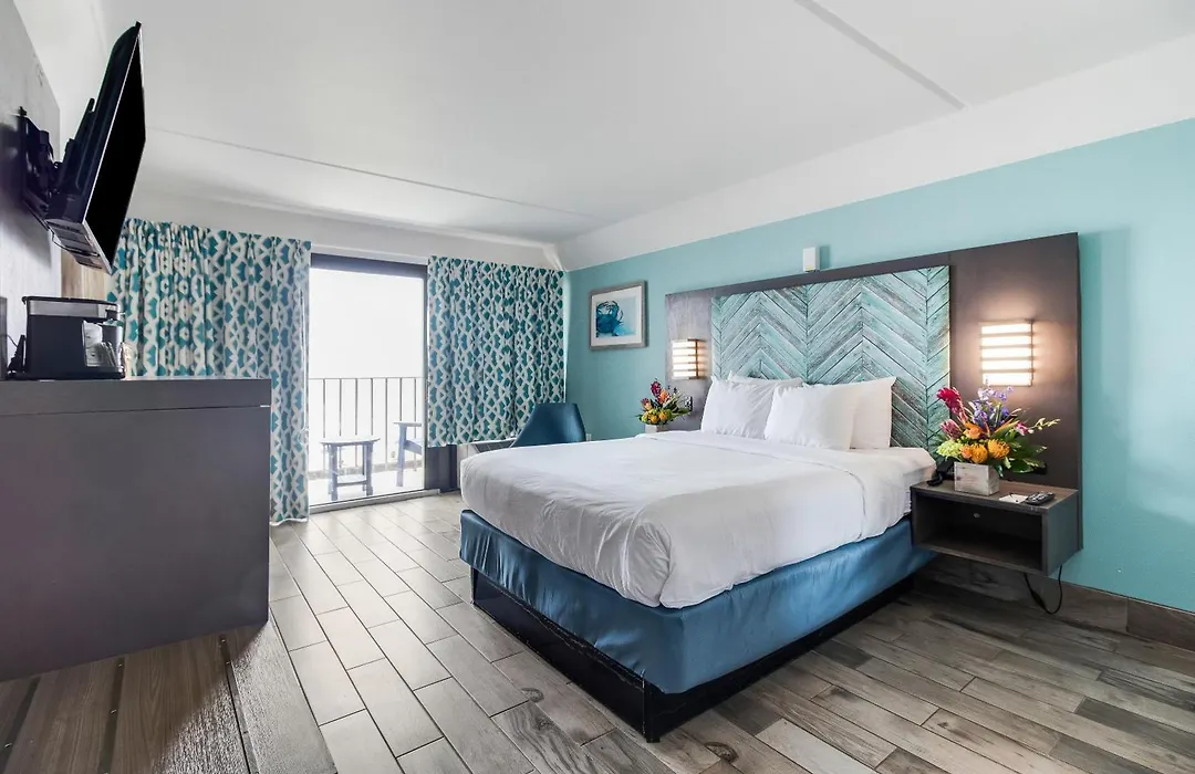 Rooms at Crystal Coast Oceanfront Hotel feature oceanfront views, including Standard Double and King Standard options, equipped with amenities like flat-screen TVs, refrigerators, and air conditioning. The hotel accommodates up to four guests in its Standard Double rooms and offers Single Queen ADA rooms for accessibility.