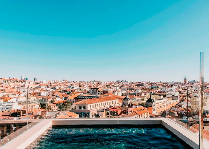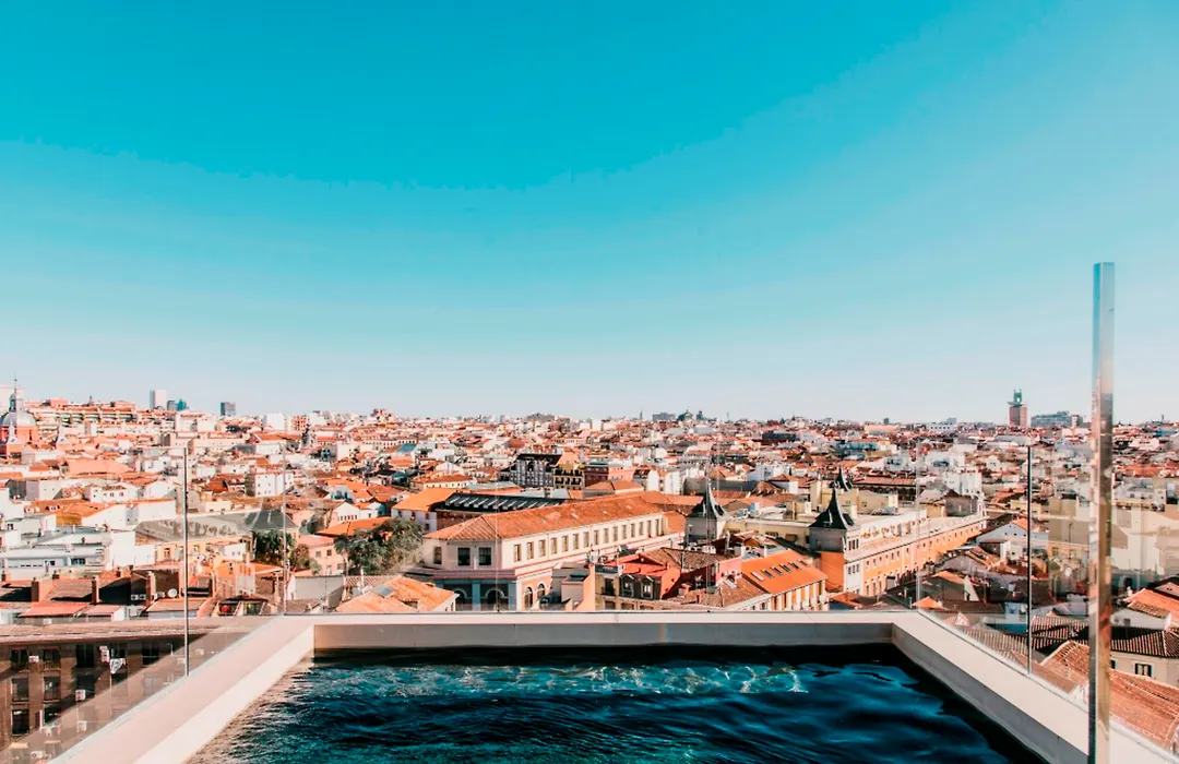The rooftop terrace provides a unique experience with a sky pool and cocktails, featuring 360o views of the Madrid skyline, where guests can enjoy sunsets over iconic landmarks. Leisure facilities also include a solarium for relaxation and a lounge area with cocktails and DJ music on select evenings.