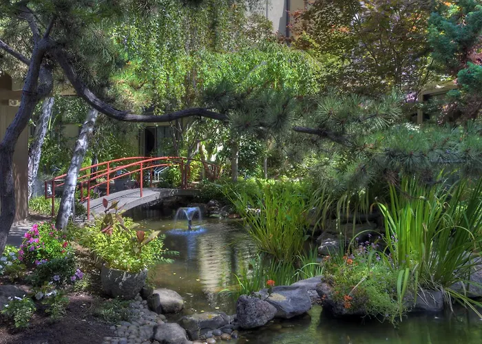 Dinah's Garden Hotel, a 4-star Palo Alto hotel with an 8.8 Booking.com rating, features unique decor and lush tropical gardens with koi ponds. Guests benefit from an outdoor pool, complimentary Wi-Fi, a fitness center, and a full-service business center.